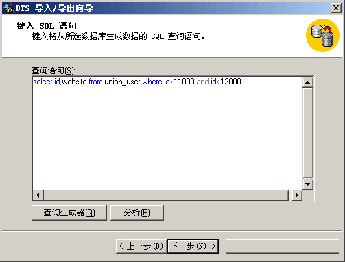 平时用的多的都是把整张表的数据从MSSQL中导出今天要导出的数据只需几个字段打开导出向导发现也很简单,只需在向导的第三步中选择"用一条查询指定要传输的数据":