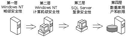 图1给出了SQL Server安全控制策略示意图。由图可见,SQL Server的安全控制策略是一个层次结构系统的集合。只有满足上一层系统的安全性要求之后,才可以进入下一层。