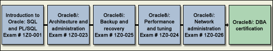 Oracle8I OCP认证过程主要包括5门考试(如下图),这些考试主要是为了测试SQL、PL.SQL知识,Oracle数据库管理、Oracle网络,备份和修复以及Oracle性能调整等等。随着Oracle8I用户的急剧增长以及版本的日益简化,这套认证程序还是非常受欢迎的。