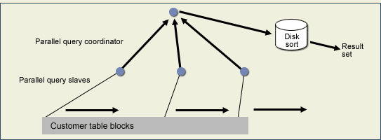 一旦表被划分成块,Oracle启用并行的子查询(有时称为杂务进程),每个子查询同时读取一个大型表中的一块。所有子查询完毕以后,Oracle将结果会传给并行查询调度器,它会重新安排数据,如果需要则进行排序,并且将结果传递给最终用户。OPQ具有无限的伸缩性,因此,以前需要花费几分钟的全表检索现在的响应时间却不到1秒。
