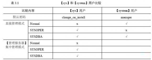 【sys】和【system】用户是安装时创建的两个系统管理员用户,但具体使用时是有区别的,如表3.1所示。