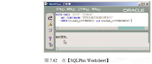 (4)读者也可以直接在【SQLPlus Worksheet】中执行createcheck.sql 文件完成检查约束条件的创建,如图7.62所示。