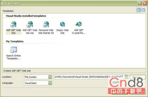运行 Visual Studio 2005。选择 ASP.NET WebSite 图标。选择语言为 C# 或 Visual Basic,如图 8 所示: