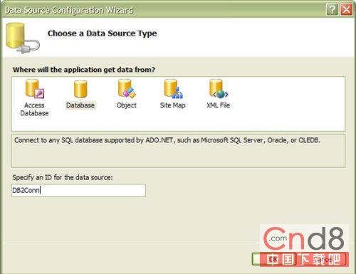 选择 Database 并为其命名,在本教程中命名为 DB2Conn。单击 OK。