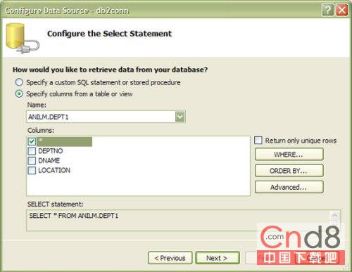您将被要求从 DB2 选择表。从选项中选择 Dept1 表,并单击 * 复选框显示所有记录。最后,单击 Finish。
