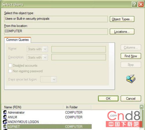 从列表中选择 ASPNET 用户并单击 OK。