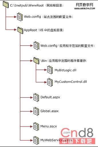 本图中的应用程序包括 \Bin 目录中的两个 DLL 文件、一个 Default.aspx 页,一个名为 Menu.ascx 的用户控件、一个名为 MyWebService.asmx 的 XML Web 服务以及一个 Global.asax 文件。另外,该应用程序是使用下列三个配置文件配置的:系统根目录中计算机级别的 Machine.config 文件、C:\Inetpub\Wwwroot 目录中站点级别的 Web.config 文件和应用程序根目录中应用程序级别的 Web.config 文件。当站点的 Web.config 文件覆盖 Machine.config 文件中的设置时,在应用程序根目录中存储的配置设置将覆盖站点的 Web.config 文件和 Machine.config 文件中的设置。