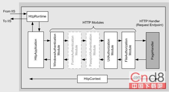 一般处理程序实现了IHttpHandler,在前面UrlRewrite部分中,我们讲到了HttpModule,其实在ASP.NET的应用程序生命周期中,有一个称之为“管道(pipeline)”的概念:一个HTTP请求,经过一个有一个的HttpModule的“过滤/处理”,最终到达一个HttpHandle的“处理器”部分,HttpModule和HttpHandle就组成了一个“管道”,非常形象哟,呵呵。贴张图吧: