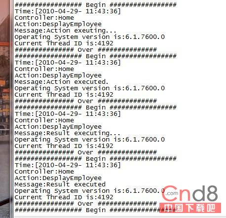 ASP.NET MVC的filter 是一个属性,可以应用到controller 后者action.当Controller或者action method 被调用时,ASP.NET MVC的filter在调用执行前后会被触发。 先看下当Control 里面的action 被调用时的利用继承,自定义类log的效果图: