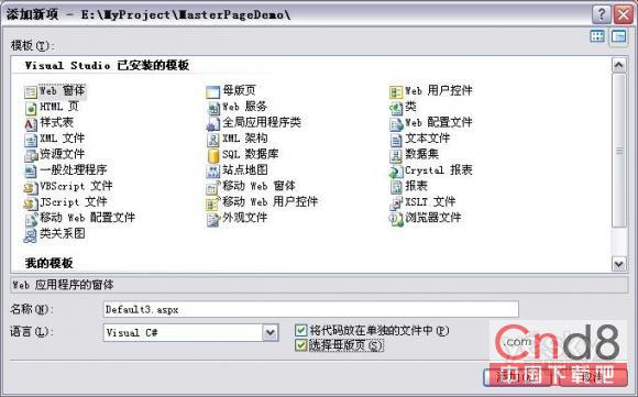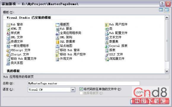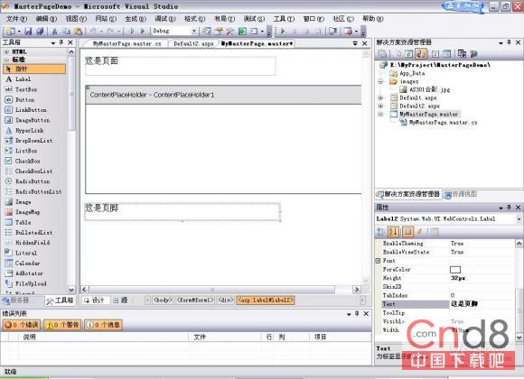 VS2005的MasterPage可以定义网站中不同网页的相同部分,如格局、页头、页脚、导航栏等。可以把这些控件定义到一个MasterPage上,其它网页继承这个MasterPage即可。继承后体现在这些网页公有部分都相同,而不同部分在于MasterPage有一个ContantPlaceHolder,这个控件定义了一个可以被其它页面继承的区域,该区域可以被其它页面用来摆放自己的控件。新建Web页面时核选上使用母版,然后选择母版即可。