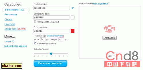 在这个被Ajax技术统治的互联网时代,很多Ajax程序都会在异步读取数据的同时,显示一个正在读取或Loading的动画,向大家推荐一个在线生成Loading预载动画Gif图片的网站,它不但提供了超多的Loading动画样式供你选择,而且你还可以自定义尺寸、颜色等参数,可谓方便到家,最最重要的是,PreLoaders.net提供的Loading预载动画生成服务完全免费,心动了吧.