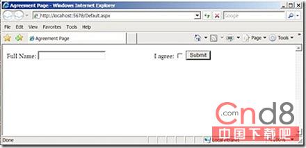 在本文中我们将测试一个简单的ASP.NET页面,用这个页面来演示认同、接受(agreement acceptance)的场景。用户在文本框中输入名字,点击“I agree”复选框,然后按下submit按钮。这显然是一个非常简单的页面,在你熟悉了WatiN框架的工作机制后,就可以将这里的理念用于大型页面的测试了。