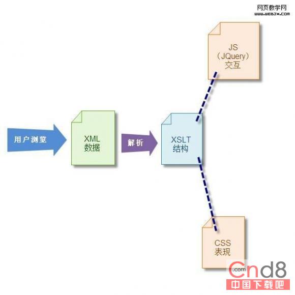 XML+XSLT+CSS的方案将数据、结构、表现进行了分离,而依托JQuery我们又可以轻松地将交互也从中分离出来,这样在客户端就达到了近乎完美的解耦。
