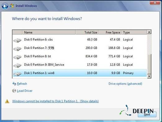 3、 挂载VHD后,继续在命令提示符下输入“d:\win8\sources\setup.exe”启动Win 8安装程序,在选择“Where do you want to install windows”(安装到什么位置)这一步,按提示将系统安装到前面挂载的VHD磁盘即可,一般为Disk 1 Partition1(即磁盘1的第1分区,磁盘0为本地硬盘。)