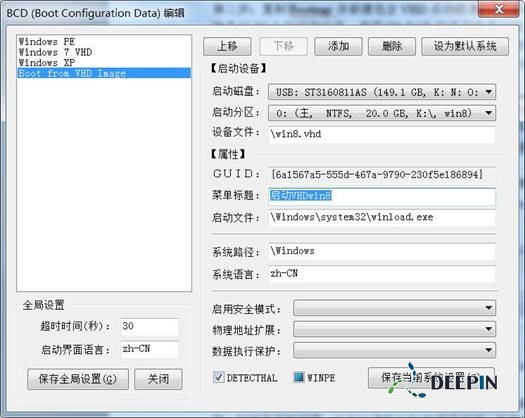 其他采用默认设置,选中新建的VHD启动菜单,单击“设为默认系统”,最后单击“保存当前系统设置”。