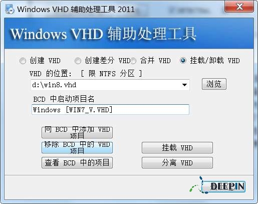 2、 接着重启Windows 7系统并按F8选择“修复计算机”,再打开“命令提示符”,输入“d:\VHD_OneKey_2011.exe”并回车以启动“Windows VHD辅助处理工具”,启动工具后选择“挂载/卸载VHD”,浏览并选择之前创建的“D:\win8.vhd”,最后点击“挂载VHD”。