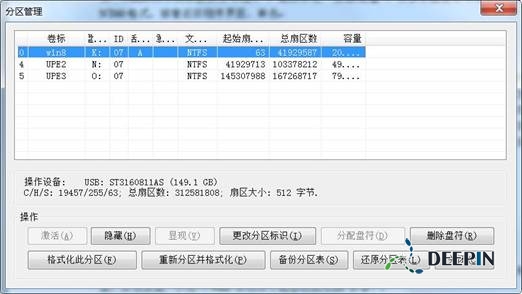 2、返回程序界面,单击“分区管理”,然后在分区列表选中移动硬盘的主分区(一般为第一分区),单击“激活”,这样我们就可以从移动硬盘启动系统了。