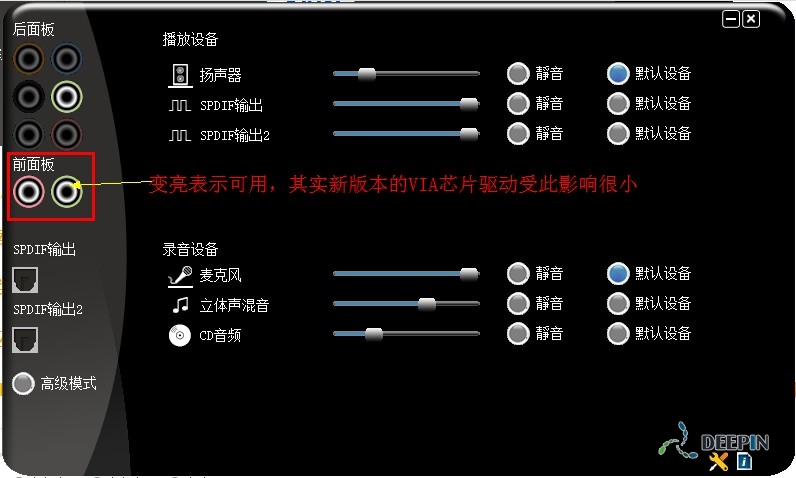 对于一般的VIA声卡无声音故障较多,更新驱动即可,如不能解决请在声卡控制面板上关闭前面板检测,最新版驱动已经默认开启前面板了