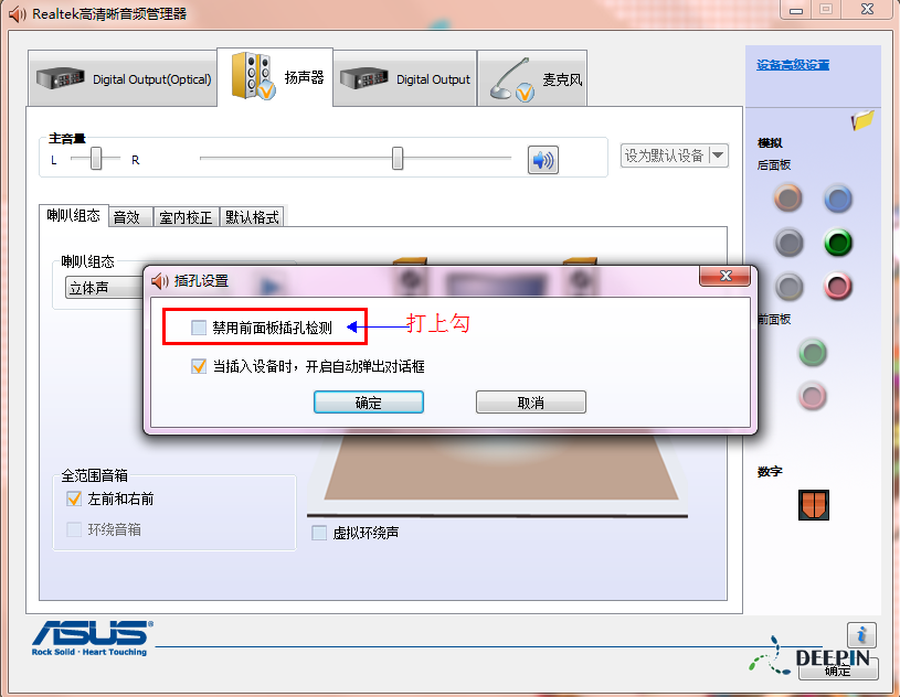 3、点击声卡控制面板的右上角的**文件夹,会出现如图所示的对话框,选中“禁用前面板检测”确定即可。