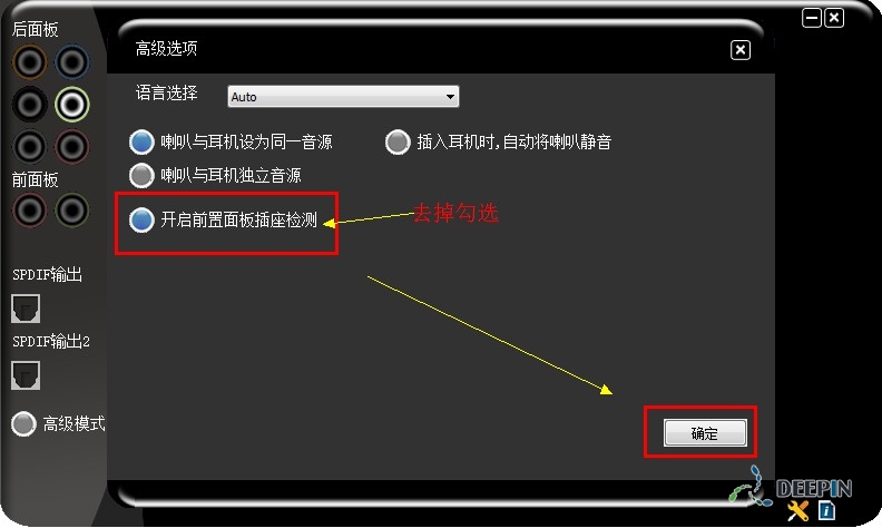 3、点左下角的设置按钮,去掉前面板检测(对于VIA新版驱动此设置意义不大)