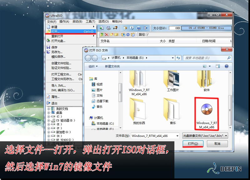 打开”,弹出打开ISO对话框,然后选择Windows 7的ISO镜像文件