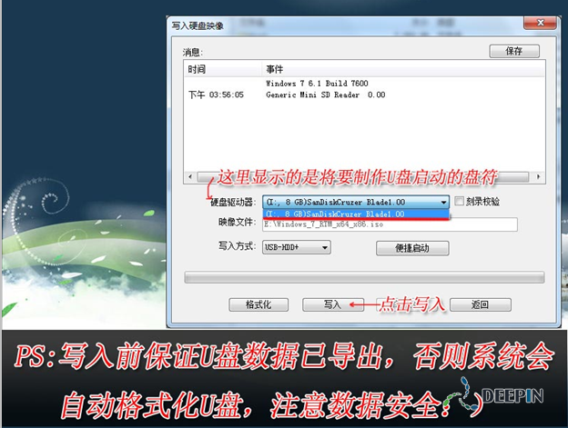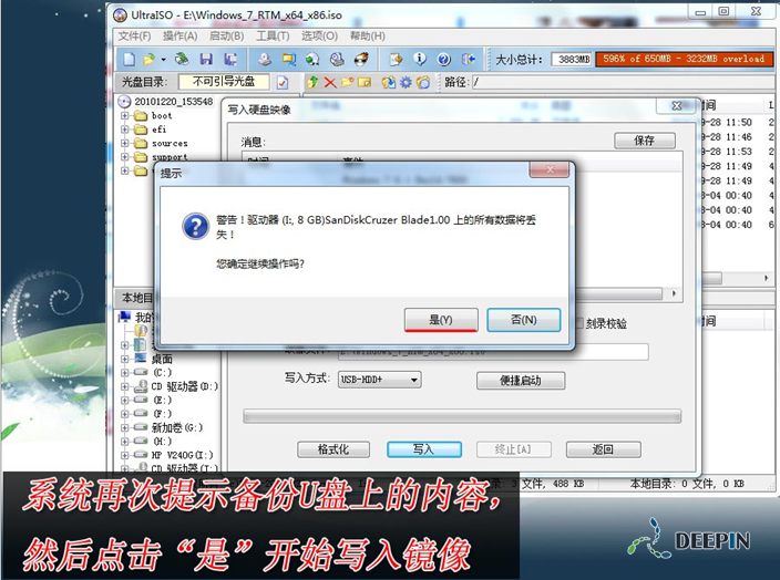 3、写入前保证U盘上面的文件已经备份,不然在写入之前系统会