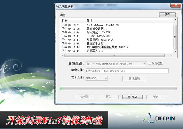 4、系统格式化U盘后,就开始刻录Win7镜像到U盘。