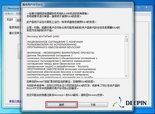 3、启动WinToFlash软件,出现最终用户许可协议对话框,选择“