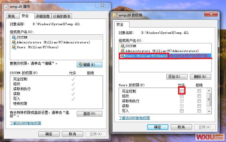 6.点击"编辑"按钮>点击自己所在用户的用户组>在"允许"列,"完全控制"行打钩(下面会自动都打上钩)>确定