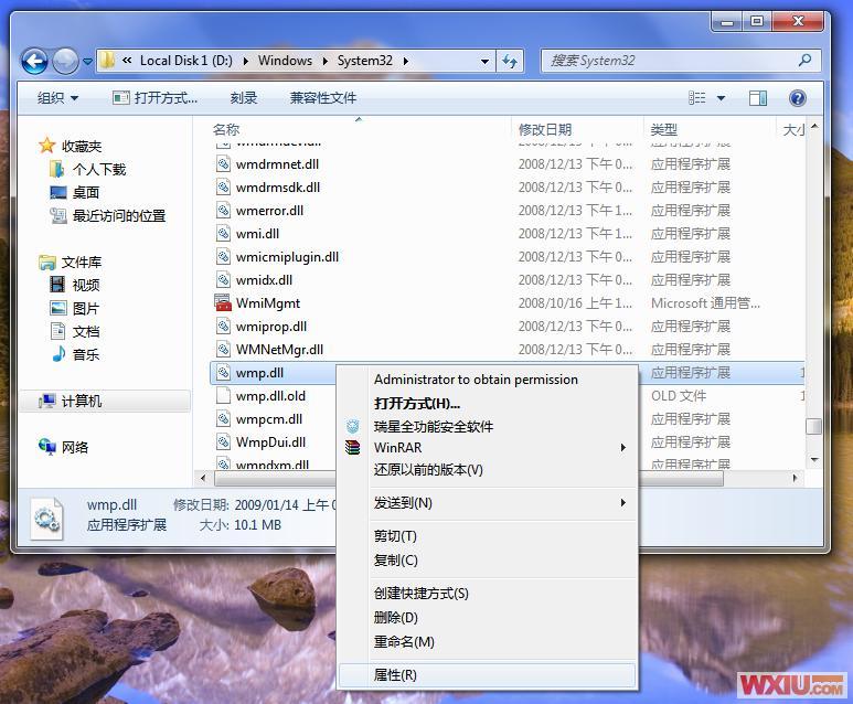 2.找到文件:wmp.dll 右键>属性