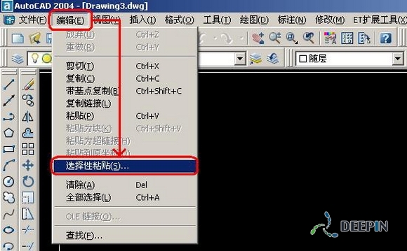 2¡¢Çл»µ½CAD³ÌÐò£¬È»ºóÑ¡Ôñ“±à¼­”—“Ñ¡ÔñÐÔÕ³Ìù”£»