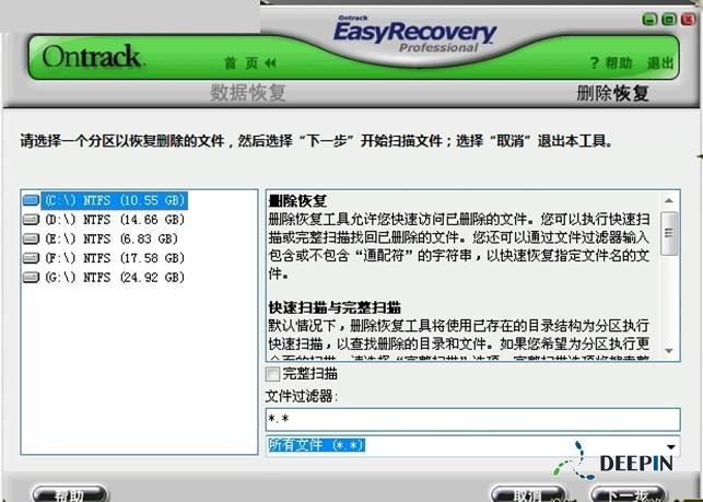 3、选择你想要恢复的文件所在驱动器进行扫描,也可以在文件过滤器下直接输入文件名或通配符来快速找到某个或某类文件。如果要对分区执行更彻底的扫描可以勾选“完全扫描”选项。