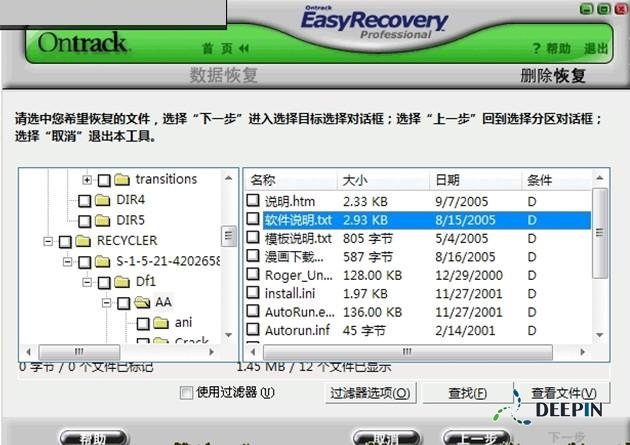 2、在右侧选择任何一种数据修复方式都会出现相应的用法提示,如我使用(删除恢复)项来查找并恢复已删除的文件时,就会在界面右侧出现相应的使用提示。