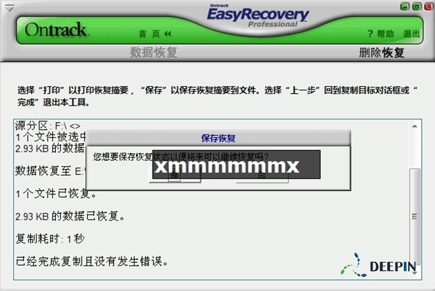 8、 当恢复完成后要退出时,它会跳出保存恢复状态的对话框,如果进行保存,则可以在下次运行EasyRecovery Professional 时通过执行EasyRecovery Professional 命令继续以前的恢复。这一点在没有进行全部恢复工作时非常有用