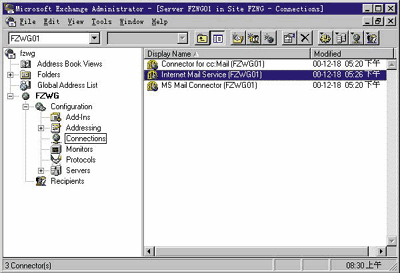 安装成功后,在管理界面中,通过双击左窗口中的"Coectio"图标,就可以在右窗口中看到新安装的Internet Mail Service,如图2所示。
