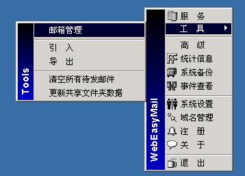 图 3   (2)工具管理设置   Web邮件服务器的工具管理如图4包括邮箱管理,邮件的导入和导出,及清空所有待发的邮件。