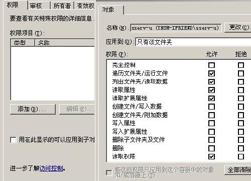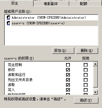 安全设定”里除了管理员和IIS用户都删除掉,再加入ERVU账号,切记SYSTEM账号也删除掉。为什么要这样设置呢?因为现在已经是用ERVU账号启动的SERV-U,而不是用SYSTEM权限启动的了,所以访问目录不再是用SYSTEM而是用ERVU,此时SYSTEM已经没有用了,这样就算真的溢出也不可能得到SYSTEM权限。另外,WEB目录所在盘的根目录还要设置允许ERV-U账号的浏览和读取权限,并确认在高级里设置只有该文件夹。(见图14)