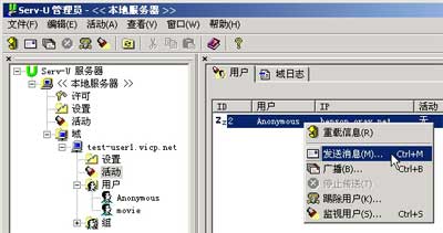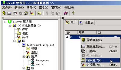 也可以单独踢人,选中域下的活动 ,在用户列表中选中用户,在右键菜单中选择踢除用户。