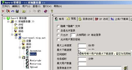 选中需要限制的用户,在常规中的最大上传/下载速度中就可以指定该用户的速度了: