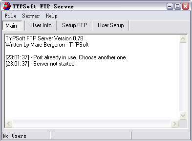 如果TYP默认设置的端口21被占用,表现状态如图1所示,列表中会显示“Port already in use.Choose another one”,结果是服务器无法启动,此时我们要手工重新设置TYP的端口,方法是选中图1所示窗口中的“Setup FTP”标签,然后在“FTP Port”后面的框中输入新端口号,再单击下面的“Save”按钮即可。