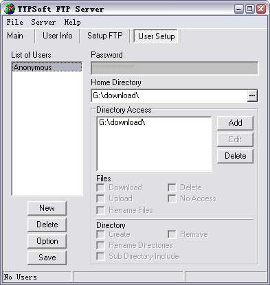 如果想用新建的用户登录,我们可以将匿名用户禁用。在图2所示的窗口中,选择“Anonymous”,然后单击按钮组中的“Option”按钮,在右边的面板中选择“Disable User Account”选项禁用匿名账户,然后再单击“New”按钮,添加一个新用户,再按照设置匿名账户的方法设置此新建账户的访问目录和相关权限,再单击“Save”按钮即可。