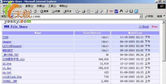 在别人的IE浏览器中输入如图1的“http://192.168.0.2:8080”,进入图6的下载界面。用户可以用各种下载工具如网络蚂蚁、Net Traortt、FlashGet下载文件,象txt、word 、excel类文档鼠标双击就能打开。共享资源就是这么简单。