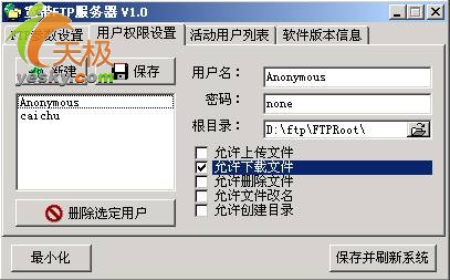2、在“用户权限设置”项(图8)中,选择文件发布的目录,在根目录中选中“d:\ftp\ftproot”目录;勾选“允许下载文件”项。