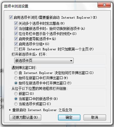 把“启用选项卡浏览”前面的钩去掉,此时所有其他选项都被封闭,然后点击确定保存设置。关闭IE窗口再重新打开就完成。