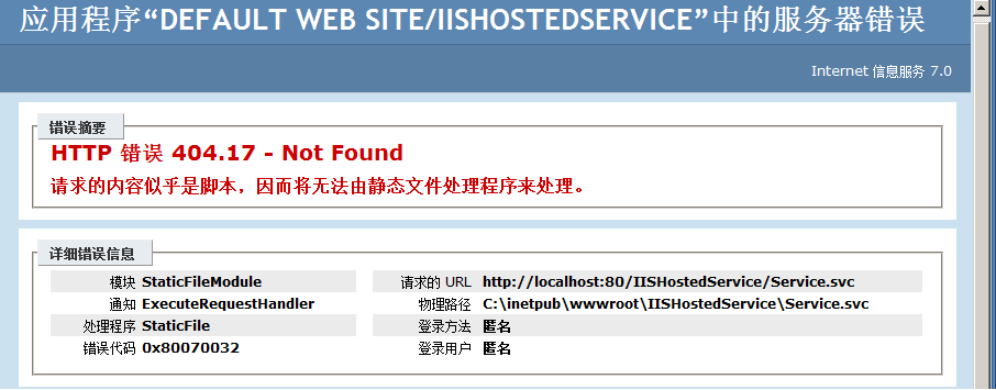 在写在IIS中寄存已有WCF服务文章的时候,创建了WCF Service模板站点,按F5运行的时候会出现“HTTP 错误 404.17 – Not Found 请求的内容似乎是脚本,因而将无法由静态文件处理程序来处理 ”的错误,如下图: