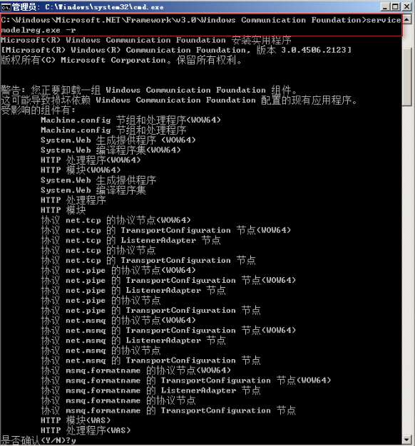 在网上查出的解决方为重新注册WCF,在命令提示符中输入如下图的命令运行即可: