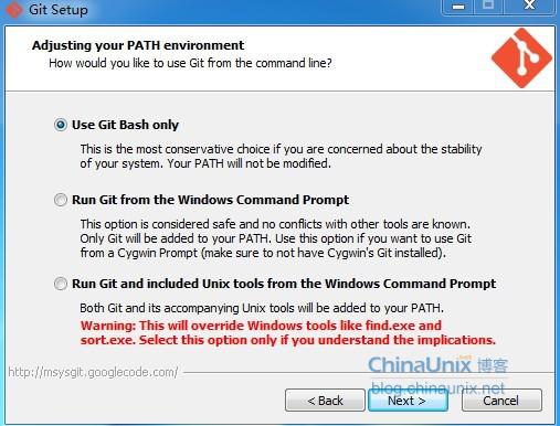 e、next进入Git Setup界面,“Adjusting your PATH environment”,选择默认值“Use Git Bash only”,如下图所示: