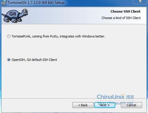 b、两步next进入“Choose SSH Client”选择界面,选择“OpenSSH,Git default SSH Client”,如下图所示: