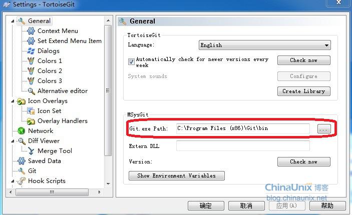 f、选择“Settings”,进入“Settings-TortoiseGit”界面,选择“General”选项卡,设置本机器的git路径,如下图所示: