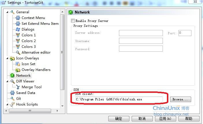 g、同时选择“Network”选项卡,设置SSH路径。SSH默认在安装Git时就安装了,在如下图所示的路径中。如下图所示: